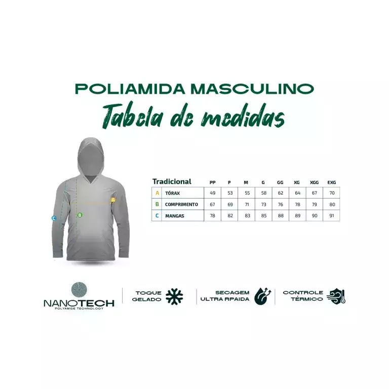 Características que fazem a diferença: - Tecido tecnológico Nanotech: conforto térmico e antifadiga - Proteção UV: segurança para sua pele sob o sol forte - Design moderno com capuz: estilo e funcionalidade em um só produto - Leveza e respirabilidade: sensação de frescor o dia todo